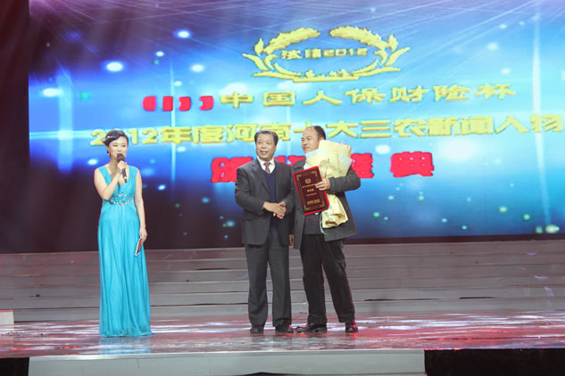 在當晚的頒獎典禮上,當選2012年度河南十大三農新聞人物的郟縣冢頭鎮陳寨中心村黨支部書記徐克儉、孟州市電力公司農電工馬四、雛鷹農牧集團股份有限公司董事長侯建芳、南陽市果然風情實業有限公司董事長陳國華等一一登臺領獎。
